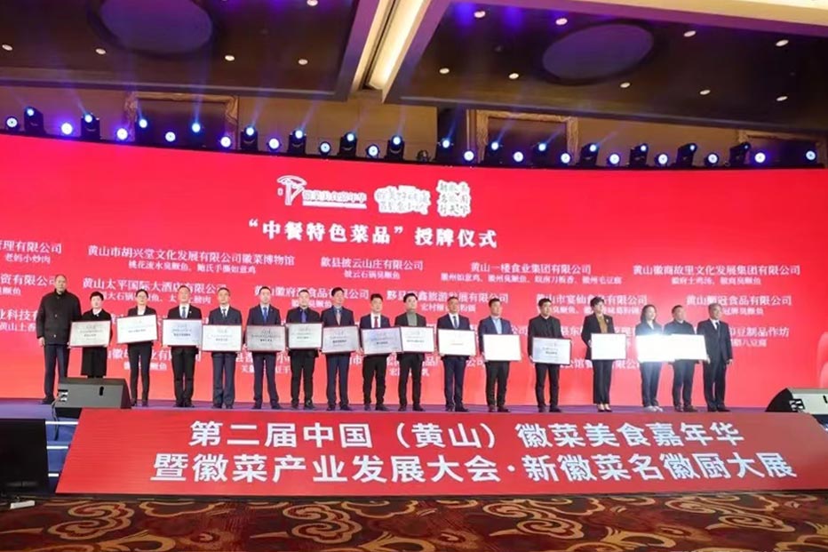 大會現(xiàn)場,依次對2022年度黃山名廚、徽菜行業(yè)領(lǐng)軍人物、十大徽菜名店和徽菜食材生產(chǎn)基地進(jìn)行了授牌、頒證。其中黃山全江生態(tài)農(nóng)業(yè)科技有限公司榮獲“2022年度十大徽菜食材生產(chǎn)基地”稱號,董事長江禮明上臺接受授牌。同時,全江刀板香和土香腸分別被列入中餐特色菜品名錄。
